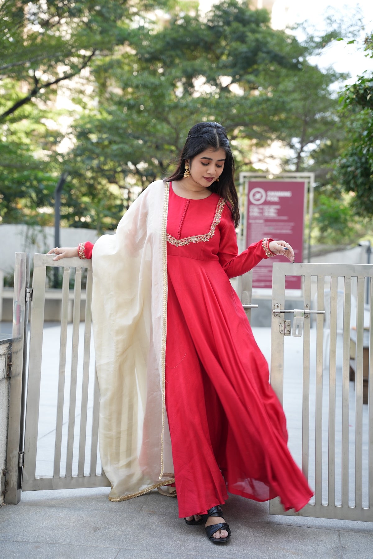 RED CHENDERI SET WITH DETAIL WORK PAIRED WITH TISSUE DUPATTA