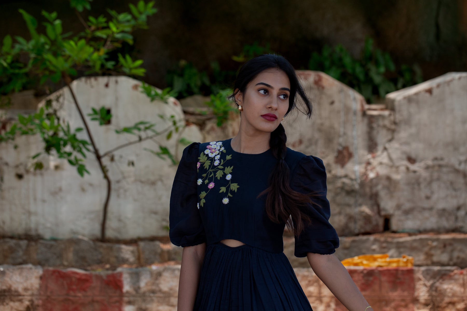 An all-black puff-sleeve dress featuring one-side floral embroidery in white, pink & yellow, plus a chic waist keyhole cut. A curated Indo-Western statement for designer-ready styling.