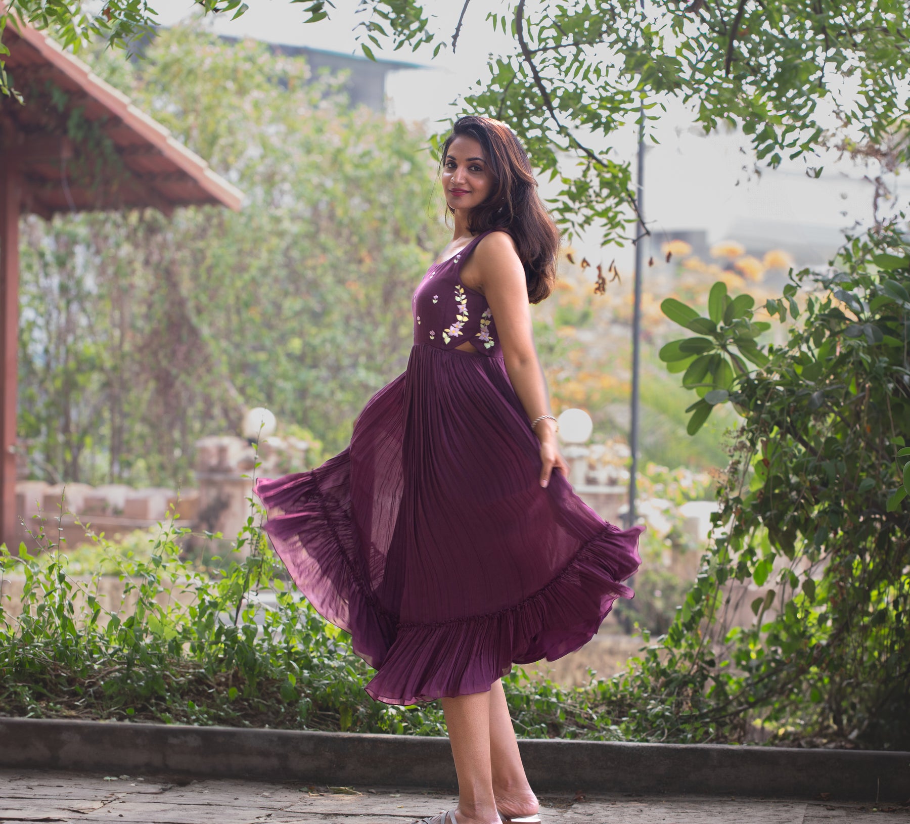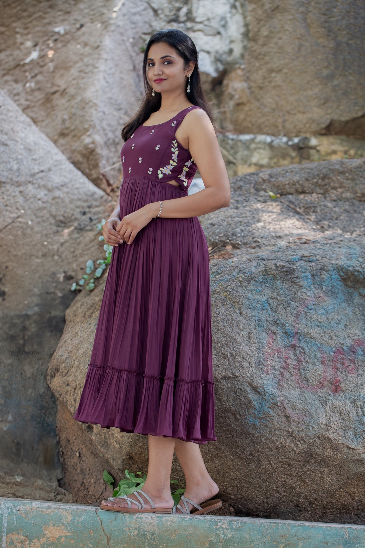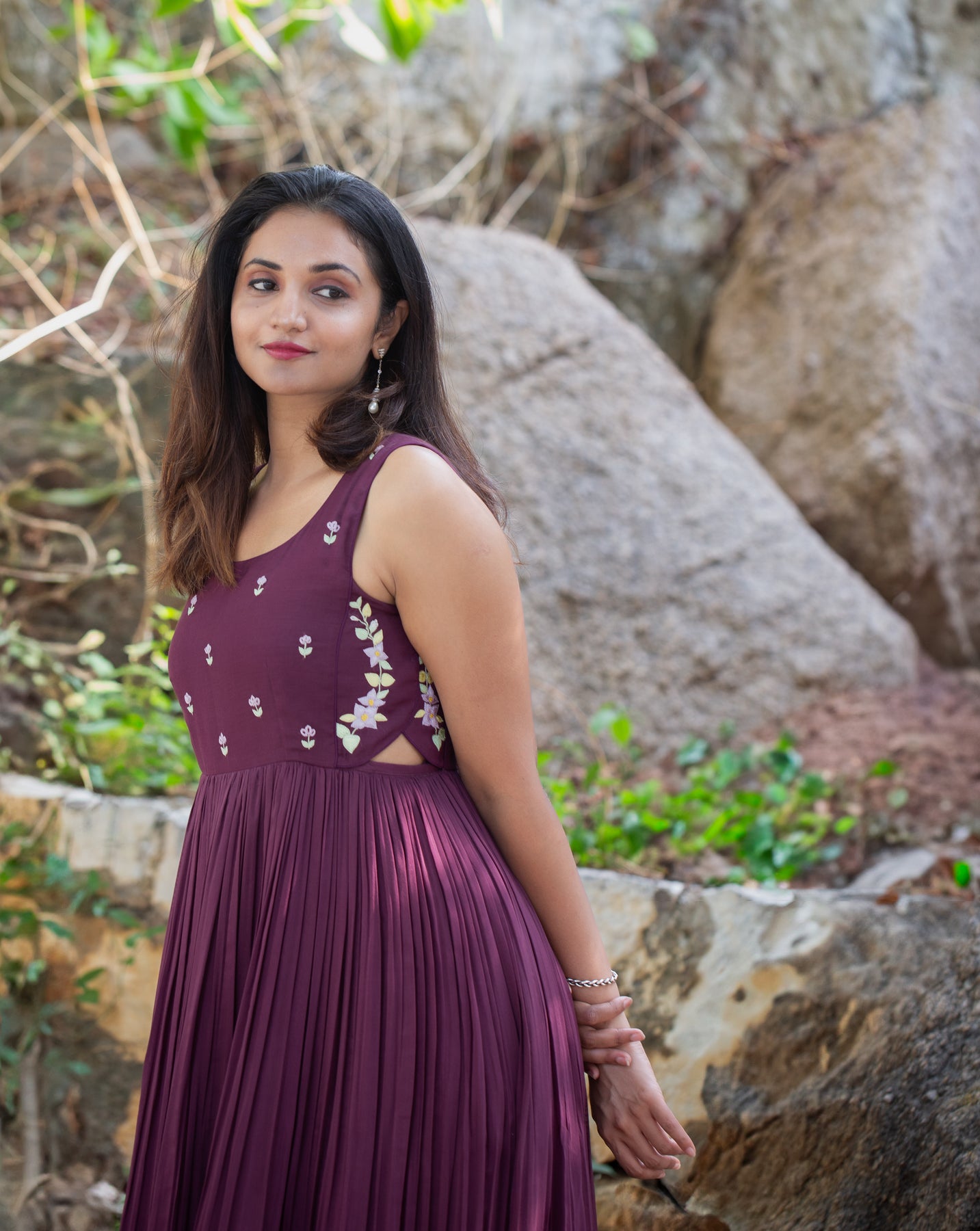 Discover this handcrafted wine-tone Malai Mul dress featuring sleeveless elegance, delicate side floral embroidery, and a flowing pleated silhouette. Ideal for festive evenings, weddings, and modern ethnic wardrobes.